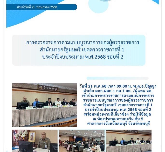 วันที่ 21 พ.ค.68 เวลา 09.00 น. พ.ต.อ.ปัญญา ดำเล็ก ผกก.ฝสต.1 กต.1 จต. /ผู้แทน จต. ร่วมตรวจราชการตามแผนการตรวจแบบบูรณาการของผู้ตรวจราชการ สำนักนายกรัฐมนตรี เขตตรวจราชการที่ 1 ประจำปีงบประมาณ พ.ศ. 2568 รอบที่ 2 พร้อมด้วยหน่วยงานที่เกี่ยวข้อง เข้าร่วมให้ข้อมูล ณ ห้องประชุมทานตะวัน ชั้น 5 ศาลากลางจังหวัดลพบุรี จังหวัดลพบุรี
