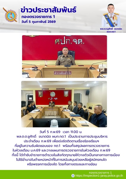 วันที่ 5 ก.พ.69  เวลา 11.00 น.  พล.ต.ต.ชูศักดิ์  ขนาดนิด ผบก.กต.1  เป็นประธานการประชุมบริหาร ประจำเด