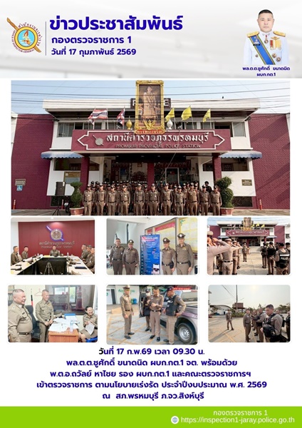 วันที่ 18 ก.พ.69  พล.ต.ท.สุรจิต  ชิงนวรรณ์  จตร., พล.ต.ต.ชูศักดิ์ ขนาดนิด ผบก.กต.1  พร้อมคณะตรวจราชก