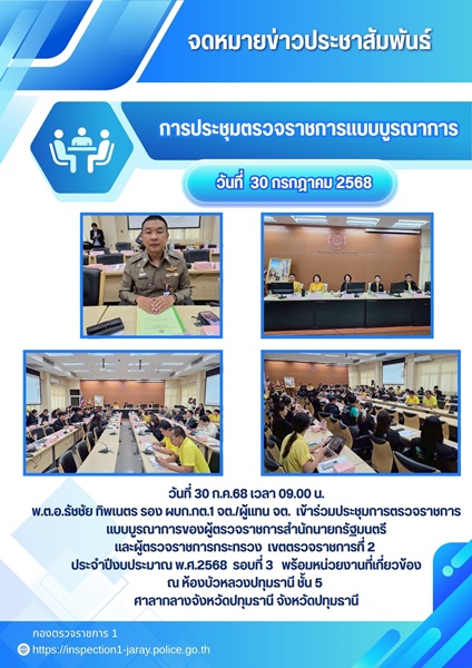 วันที่ 30 ก.ค.68 เวลา 09.00 น.พ.ต.อ.ธัชชัย ทิพเนตร รอง ผบก.กต.1 จต./ผู้แทน จต. เข้าร่วมประชุมการตรวจ