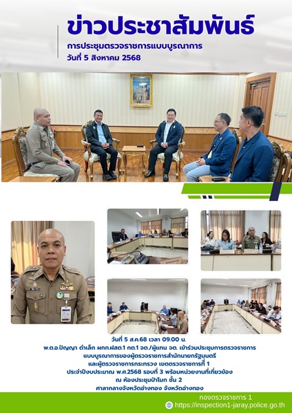วันที่ 5 ส.ค.68 เวลา 09.00 น. พ.ต.อ.ปัญญา ดำเล็ก ผกก.ฝสต.1 กต.1 จต./ผู้แทน จต. เข้าร่วมประชุมการตรวจ