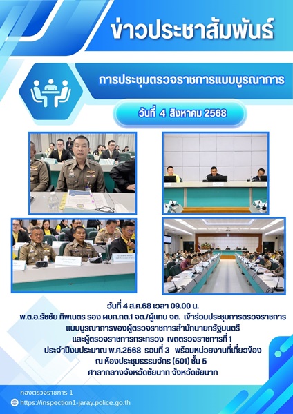 วันที่ 4 ส.ค.68 เวลา 09.00 น. พ.ต.อ.ธัชชัย ทิพเนตร รอง ผบก.กต.1 จต./ผู้แทน จต. เข้าร่วมประชุมการตรวจ